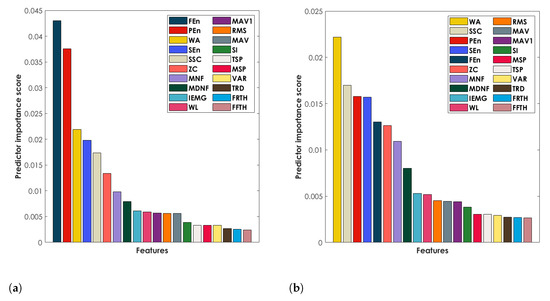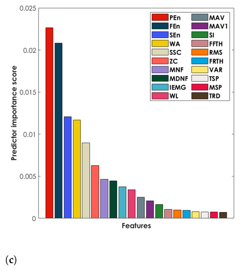 The comparison between FEn and PEn with the other 18 classical sEMG-based features obtained by using the mRMR algorithm is reported in Figure 7, where the whole 20 measures are ranked according to their predictive importance score. FEn was computed with and and PEn with , since these values provided the best performances in terms of gesture clustering. For two out of the three considered gesture sets (set 1 and set 3) the FEn and PEn showed the highest predictive importance (Figure 7a,c), while for the remaining set (set 2) they were within the best five features according to their predictive score (Figure 7b).