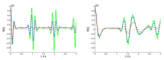 As shown in Figure 1, the behavior of the function is illustrated with a fixed parameter , , and the other rates vary; specifically, and , which are related to the dissipation terms and dipole–dipole interactions, respectively. For example, for and , exhibits quasi-regular fluctuations between 1 and around the zero value. The population inversion demonstrates periods of revivals and collapses similar to the two-photon JCM [58]. When the dissipation term is taken into account, and , the amplitudes of the oscillations decrease as the scaled time increases; see Figure 1a
