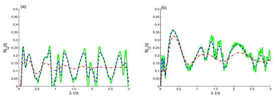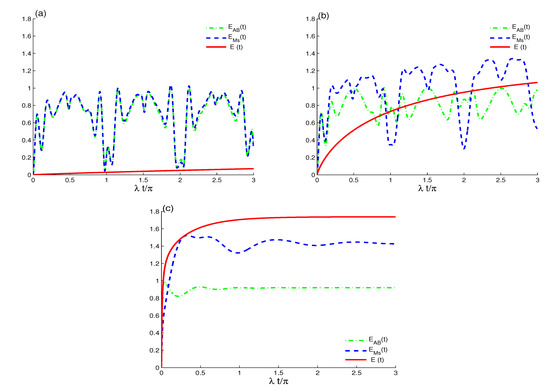 The numerical results of the entropy functions were obtained by numerically computing the eigenvalues of the density matrices of Equations (7), (10), and (11), and using the entropy Formulas (14) and (15). As shown in Figure 3, Figure 4 and Figure 5, the quantum coherence’s growth is analyzed by the functions , and using the same initial parameters as Figure 1. Since the atomic inversion’s revival periods decrease in the presence of the rates of the dipole–dipole interactions and the decoherence term, the TLAS–EMF system never reaches an initial pure state when the rates and are not equal to zero.