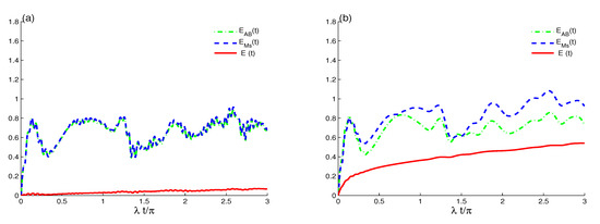 Figure 3a shows the dynamics of the , , and in the absence of the dipole–dipole interactions and dissipation term. The TLAS, EMF, and TLAS–EMF systems’ states start from the initial pure states and evolve into mixed states. The entire entropy has small values compared with the values of and . The functions of and have approximately the same dynamic behavior and reach their minimal values at the middle point of the revival intervals, and the curves never reach their initial pure state, as shown in Figure 2a. Of note, the entropies gradually increase to their maximum values before and after the revival periods and then decrease to minimum values in the middle of the collapse periods.