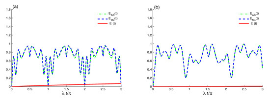 If the dissipation term is neglected, Equation (11) is governed only by the unitary interactions of the TLAS–EMF system, so the TLAS–EMF system’s state is pure, . According to the A-LI inequality, Equation (22) becomes , and they are used to quantify the entanglement/mixedness. If the dissipation term is considered, then the TLAS–EMF state is a mixed; therefore, and , and the partial entropies are used to measure only the mixedness in the subsystems.