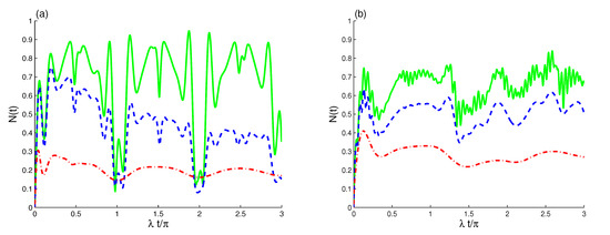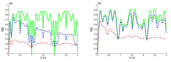 Figure 9a confirms that the Bargmann number has the same the effect on the previous quantum phenomena. For the case , the TLAS–EMF interactions lead to generate atomic entanglement periodically with -period. Compared to the case of Figure 8a, the time intervals of the sudden appearance and disappearance of the entanglement are increased clearly. Figure 9b shows that the ability of the TLAS–EMF interactions to generate the entanglement is weakened with the small initial coherent field intensity.