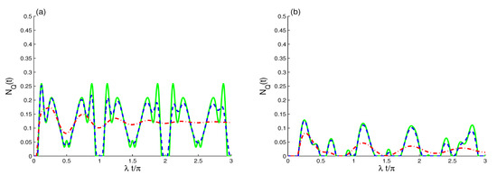 As Figure 1a,b but for in (a) and in (b) with different decoherence values of : (green solid curves), (blue dashed curves), and (red dashed dot curves).
