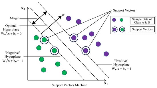 ML algorithms are broadly classified among supervised learning and unsupervised learning. SVM is a popular supervised learning algorithm and is frequently used to evaluate data for classification and regression analysis. SVM is primarily designed only for two-class distribution [58], but presently the algorithm is advanced and successfully works with multi-class classification problems using kernel tricks [59] and soft margin. This study involves kernel trick with hyperparameter tuning (explained further) for classifying the multi-class building samples to their respective classes. Figure 2 shows the elementary SVM classifier mechanism while evaluating two linearly separable classes; for instance, the feature points are considered belonging to the positive class and negative class. SVM takes the feature points and draws the hyperplanes, which separates the points into their belonging classes. An optimal hyperplane or decision boundary is the one that fits best to segregate the feature points. Margin determines the distance of the decision boundary from the nearest data points. Support vectors are the feature points closest to the optimum hyperplane, located at a minimum distance from it.