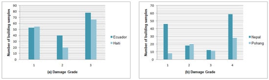 (a) Data for Ecuador and Haiti and (b) the data for Nepal and South Korea. The distribution of sample buildings over the damage classes is non-uniform. South Korea has the least number of samples among the other datasets.