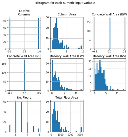 With the histogram’s help, the distribution of data of all the eight parameters within a dataset is assessed. Figure 4 represents the histogram for Ecuador. The abscissa of the plots represents the scale between the highest and the lowest value of each parameter. The frequency distribution of the values shows non-linearity in the variation; rather, column area, Masonry Wall Area (NS), number of floors, and total floor area show Gaussian distribution yet skewed to the left. Masonry wall Area (EW) is distinct from an exponential distribution. Concrete wall area for Y and X directions show no data, while captive columns are distributed bimodally. Haiti, Nepal, and South Korea follow similar non-linear behavior for data distribution.