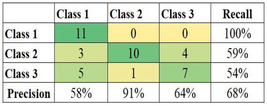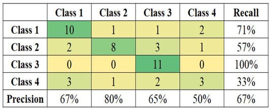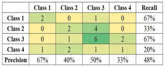The model’s certainty to predict the class of the unknown samples correctly defines its efficiency, illustrated by various factors, like confusion matrix, accuracy, recall, and precision. The confusion matrix visualizes the performance of the model by producing numbers of samples predicted correctly and incorrectly. Precision, also known as Positive Predictive Value or PPV, is the fraction of cases when the model identifies the class of the sample correctly. Accuracy is the measure of correctly predicted sample points out of the complete data. Recall or sensitivity is the fraction of cases rightly identified as belonging to the respective class amidst all the samples that correctly fit that class. While evaluating the four datasets, all the four mentioned factors are considered. Figure 5, Figure 6, Figure 7 and Figure 8 present the confusion matrix and calculated Precision and Recall for each class for datasets of Ecuador, Haiti, Nepal, and South Korea. The (3 × 3) or (4 × 4) size of the confusion matrix follows the number of classes in the respective datasets.