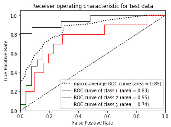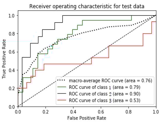 Ecuador—ROC curves for each class of test dataset. The sample data for classes 1 and 2 are classified better than class 3, as the curve for class 3 is below the threshold. The result also indicates that the false positive rate for class 3 is high.