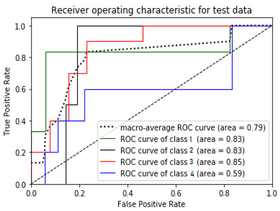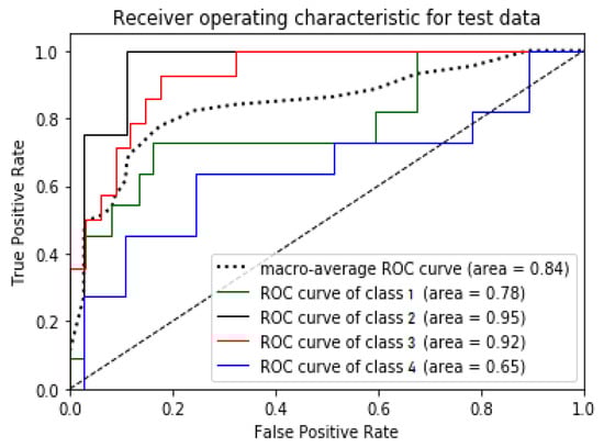 Nepal—ROC curves for each class of test dataset. The classifier classified classes 2 and 3 better than classes 1 and 4 samples. A higher false-positive rate appeared for class 4.
