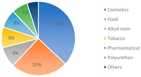 Glycerol has versatile applications in medical, pharmaceutical, personal care, and food industries as sweetener, flavour, preservative, emulsifier, humectant, antioxidant, and additive. It is also used in the automotive and chemical industries as a plasticizer, lubricant, and cryoprotectant [6,7,8]. The distribution of some of these applications varies in different literature reports. The percentage distribution, as found in various literature articles, is shown in Figure 1 [9]. It has been reported that glycerol is among the 12 most important bio-based chemicals worldwide [10], with the global market expected to reach USD 2.52 billion by 2020 [11].