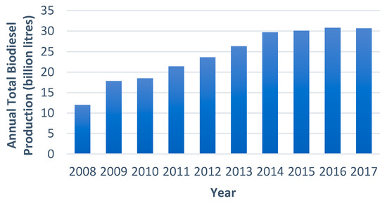 Glycerol can be obtained via synthetic or natural means. The synthetic route is usually through propylene oxidation or chlorination, while the natural route involves the hydrolysis of vegetable oil and or the transesterification of fatty acids or vegetable oil as well as the fermentation of yeast [4,12,13]. The synthesis of glycerol via propylene is based on petroleum feedstock (Scheme 1) and is no longer popular due to the global shift to less carbon emission. The hydrolysis of oil, also known as saponification, involves the reaction of triglyceride with alkaline hydroxide (Scheme 2). It is an old method that dates back to 2800 BC and accounted for most of the commercial needs over the years [14,15]. However, production through this method is no longer meeting the global need. The fermentation method is limited in industrial applications. The transesterification method involves the reaction of triglyceride (oil) with alcohol in the presence of a catalyst, which results in the production of biodiesel (fatty acid esters) and glycerol (Scheme 3). The transesterification method is now the most popular because of the large quantity of biodiesel produced. Biodiesel is considered to be an environmentally benign renewable energy that is biodegradable, non-toxic, and renewable with less obnoxious emissions [11,16]. The transesterification method also produced glycerol as a by-product, which is known as crude glycerol due to its low-grade purity. The recent increase in biodiesel production has led to a proportional increase in the crude glycerol. It has been reported that for every 100 kg of biodiesel produced, 10 kg (10%) of glycerol is obtained as the by-product leading to surplus in the market [12,17,18]. Recent literature indicates that by the year 2020, the global production of glycerol will move up to 41.9 billion litres [19]. This number is expected to increase with the recent prediction that biodiesel will account for over 70% of the global transportation fuel by 2040 [20]. This forecast is supported by many deliberate policies put in place by different countries and organizations to encourage biodiesel production and its utilization, such as the implementation of mandatory biodiesel blending targets, tax exemptions, government support, investment subsidies, and research and development programs [20]. Figure 2 shows the progressive increase in biodiesel production for the last ten years [21]. The above policies have led to the diversification of biodiesel feedstocks depending on the country, as indicated in Table 1. The impact of excess glycerol produced from the transesterification process is already felt in the market [22].
