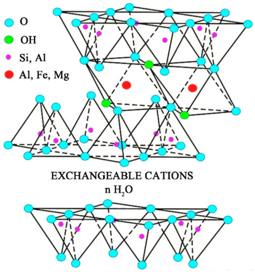 Montmorillonite is an aluminohydroxysilicate (an octahedral AlO6 layer sandwiched between two tetrahedral SiO4 layers), which is the main constituent of most clay minerals. Most clay minerals are swellable (and also reversible) and have high ion-exchange capacity, and hence are widely used in catalysis generally [117]. The representative structure of montmorillonite clay is shown in Figure 4. Recent advances have shown various modifications of montmorillonite, thereby improving its Bronsted and Lewis acids and pore size distribution [118]. These modifications might have informed their deployment as a catalyst and catalyst support in glycerol acetylation. Kakasaheb et al. [91] reported the synthesis of a series of sulphuric acid-modified Montmorillonite (K-10) catalysts (10, 20, and 30% (w/w) H2SO4/K10). They were used for the acetylation of bio-glycerol with acetic acid at reaction conditions of 120 °C, 0.4 g catalyst loading, the glycerol-to-acetic acid molar ratio of 1:12, and for 5 h. Furthermore, 20% (w/w) H2SO4/K10 performs better with 99% glycerol conversion and 23%, 59%, 15%, and 2% yield towards monoacetin, diacetin, triacetin, and diglycerol triacetate. The obtained results were found to correlate with the acidity and other textural properties of the catalysts. The reusability of 20% (w/w) H2SO4/K10 catalyst was fairly good because, after three reaction cycles, only the partial deactivation of the catalyst was noticed, which was partly attributed to coke deposition and a loss of active acid sites. In a related study, the organic acids-treated montmorillonite clay performed better as a catalyst in acetylation than the untreated [87]. The organic acids used include methanesulfonic acid (MSA), p-toluenesulfonic acid (pTSA), and phenoldisulfonic acid (PDSA), and over 90% glycerol conversion was obtained in each case when compared with the untreated montmorillonite clay with only about 60% glycerol conversion. The selectivity towards triacetin was favoured with the organic acids-treated clay in the following order: PDSA > MSA > p-TSA > untreated clay. The performance was attributed to the enhancement of the catalyst’s acidity and pore characteristics (increase in pore volume, especially around the acid sites) arisen from the organic acid’s treatment. In another study, the modification of montmorillonite with metals enhanced the selectivity towards diacetin. The lanthanum cation-exchanged montmorillonite (La3+-mont), was found to be efficient with 98% glycerol conversion and selectivity of > 99% towards diacetin only. However, when the La3+ was substituted with Ce4+, Sc3+, Ti4+ and Fe3+, selectivity towards monoacetin and triacetin improved at 120 °C, glycerol-to-acetic acid molar ratio of 1:2, and reaction time of 24 h [109] which is not cost effective.