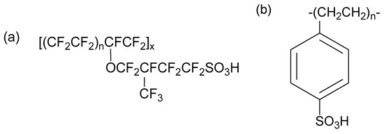 Structure of ion exchange resin catalysts: (a) perfluorinated resinsulfonic acid (Nafion) (b) sulfonated polystyrene (Amberlyst) [128,129].