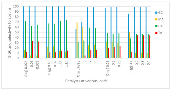 Influence of various catalyst loads on glycerol conversion (GC) and selectivity to monoacetin (MA), diacetin (DA) and triacetin (TA) using different catalysts at various reaction conditions (A = SSBA, glycerol (G):acetic acid (AAc) 1:3, T = 105 °C, t = 3 h [92]; B = glycerol-based carbon, G:AAc 1:4, T = 115 °C, t = 1 h [126]; C = cesium phosphotungstate (CsPWA), G:AAc 1:8, T = 85 °C, t = 2 h [89]; D = 2 M H2SO4/Al2O3, G:AAc 1:9, T = 110 °C, t = 5 h [106]; E = glycerol-based carbon, G:AAc 1:3, T = 110 °C, t = 3 h [114].