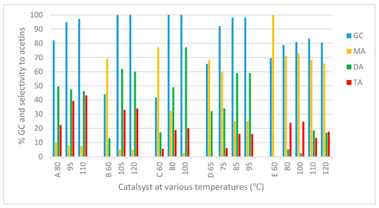 Influence of temperature on glycerol conversion (GC) and selectivity to monoacetin (MA), diacetin (DA) and triacetin (TA) using different catalysts at various reaction conditions (A = amberlyst-15 (Dry), glycerol (G):acetic acid (AAc) 1:9, catalyst load (CL) = 2.645 g, t = 5 h [83]; B = propyl-SO3H-functionalized mesoporous silica SBA-15 (SSBA), G:AAc 1:3, CL = 50 mg, t = 3 h [92]; C = SO42−/12ZrKIL-2, G:AAc 1:10, CL = 0.1 g, t = 2 h [105]; D = CsPWA, G:AAc 1:8, CL = 7 wt%G, t = 2 h [89]; E = 1Ag-10Cu-rice husk silica–Al2O3, G:AAc 1:10, CL = 80 mg, t = 5 h [90].