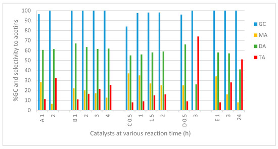 Influence of the reaction time on glycerol conversion (GC) and the selectivity to monoacetin (MA), diacetin (DA) and triacetin (TA), using different catalysts at various reaction conditions (A = HSiW/ZrO2, glycerol (G):acetic acid (AAc) 1:10, T = 120 °C, CL = 0.3 g [131]; B = glycerol-based carbon, G:AAc 1:4, T = 115 °C, CL = 5 wt%G [126]; C = CsPWA, G:AAc 1:8, T = 85 °C, CL = 7 wt%G [89]; D = arenesulfonic acid-functionalized bentonite, G:AAc:toluene 1:7:1.4, T = 100 °C, CL = 0.074 wt%G [147]; E = SBA–propyl sulfamic acid, G:AAc 1:3, T = 105 °C, CL = 50 mg [94].