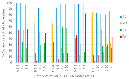 Influence of glycerol to acetylating agent (G:AA) molar ratios on glycerol conversion (GC) and selectivity to monoacetin (MA), diacetin (DA) and triacetin (TA) using different catalysts at various reaction conditions (A = 3% Y/SBA, AAc = acetic acid, T = 100 °C, CL = 0.2 g, t = 3 h [82]; B = 20 mol%MnO3/SiO2, AAc, T = 100 °C, CL = 10 wt%G, t = 8 h [132]; C = CsPWA, AAc, T = 85 °C, CL = 7 wt%Gly, t = 2 h [89]; D = CsPWA, AAh = acetic anhydride, T = 30 °C, CL = 4 wt%G, t = 2 h [89]; E = 1Ag-10 Cu-rice husk silica–Al2O3, AAc, T = 110 °C, CL = 80 mg, t = 5 h [90].
