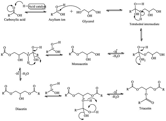 Various articles report the plausible reaction mechanism in the acetylation of glycerol with acetic acid [58,83,84,85,86,87]. The mechanism proceeds via the activation (protonation) of the carbonyl group of the acetic acid by a strong acid catalyst (usually Bronsted-type acid). The resultant acylium ion makes it more susceptible to nucleophilic attack by the oxygen atom of the hydroxyl molecule attached to glycerol, thereby forming a tetrahedral intermediate and leading to the transfer of hydrogen to the next hydroxyl molecule (attached to the carbonyl carbon) to form a water molecule. On the loss of the water molecule, a monoacetin (monoacetyl glycerol) is formed, and on further reaction with acetic acid following a similar mechanism, diacetin (diacetyl glycerol) is formed, and finally, triacetin (triacetyl glycerol) is formed as shown in Scheme 5.