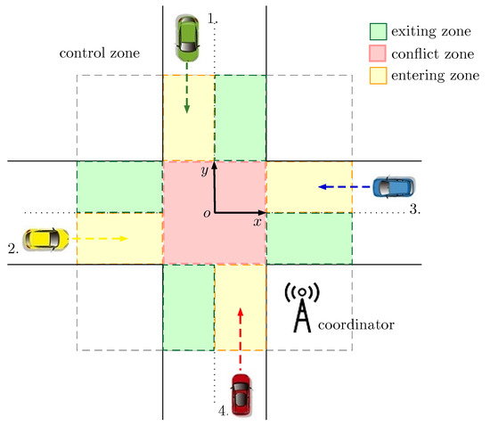 - Yao, N.; Zhang, F. Resolving Contentions for Intelligent Traffic Intersections Using Optimal Priority Assignment and Model Predictive Control. In Proceedings of the 2018 IEEE Conference on Control Technology and Applications (CCTA), Copenhagen, Denmark, 21–24 August 2018; pp. 632–637. [Google Scholar]