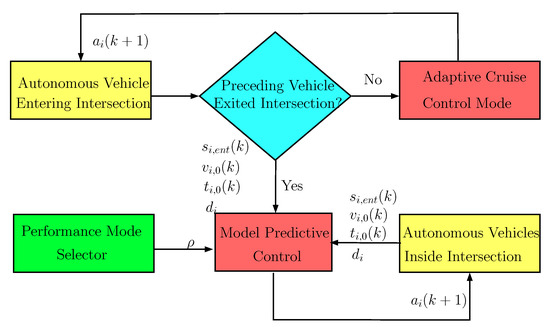 The operation of the intersection MPC control is shown in Figure 2. The coordinator of the intersection collects the position and velocity data , i∈ [1…n] of each autonomous vehicle entering the intersection at a discrete time step k using a sampling time , along with their turning intention . For the newly entered vehicle, a decision is made based on the position of the preceding vehicle, whether to add the vehicle to the MPC optimization process, or switch to adaptive cruise control mode. Note, that for the MPC optimization method the control performance can be set by the scheduling variable . At each discrete time step k, based on the predefined value the solution of the time-optimal, energy-optimal or multicriteria vehicle ordering is calculated based on the analytical method detailed in Section 3.3, Section 3.4 and Section 3.5 for a time horizon i∈ [1…n]. Note, that the time horizon depends on the vehicle states and the intersection geometry, and the optimization problem is solved in a single control problem for all vehicles. Moreover, newly entering vehicles only join the MPC optimization process when the preceding vehicle leaves the intersection, thus the optimization proceeds with maximum four vehicles at the same time. The solution of the optimization gives the control variables i∈ [1…n], which the autonomous vehicles in the intersection follow until the subsequent time step, where the optimization is repeated with the forward shifted horizon. Since the vehicle ordering and prescribed accelerations are recalculated at every time step for vehicles in the entering zone, a sampling time s is selected to avoid chattering of the control signals. Note that present MPC method is inherently robust against bounded initial errors in the measurement signals, since as the accuracy of the signals improve as the vehicles get closer to the intersection origin, the online recalculation of the MPC controller adjusts the vehicle order and control inputs to the punctual data.