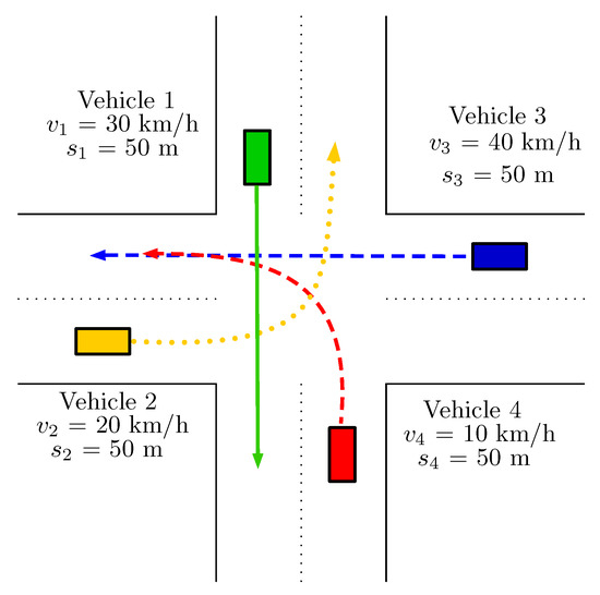 For the sake of comparison, a four-directional double lane intersection has been chosen with four vehicles having initial conditions and turning intentions shown in Figure 3. As illustrated, Vehicle 1 and Vehicle are heading straight, while Vehicle 2 and Vehicle 4 are turning left with a 28 km/h speed constraint for entering the intersection.