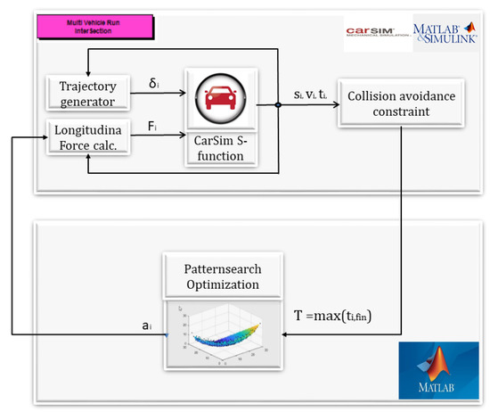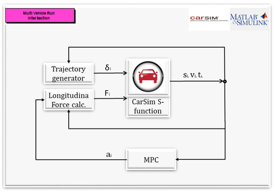 Next, the proposed time-optimal MPC intersection control has been evaluated with the same initial conditions depicted in Figure 3. The scheme of the real-time MPC control implemented in CarSim environment is depicted in Figure 5.