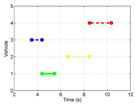 If the autonomous vehicle has to stop to give priority to other vehicle (or vehicles), a waiting time is also computed. In this case, the value is set in order for the vehicle to stop in front of the conflict zone. The waiting time is defined as the difference between the final time of the previous vehicle and the entry time of the subject vehicle. After the conflict zone is free, i.e., , the autonomous vehicle enters the conflict zone with the predetermined acceleration , hence the travel time in the intersection is given as follows: