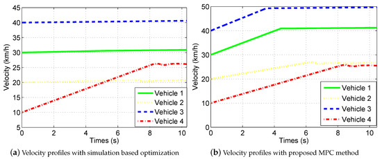 Although the ordering of the vehicles are the same and the total traveling time is similar, the velocity profiles are different for the proposed MPC and the simulation-based optimization method, as depicted in Figure 7a,b. Note, that while the velocity of Vehicle 4 is similar for both cases, the other vehicles choose different acceleration values due to the nature of the underlying algorithm. With the solution of the simulation-based optimization, Vehicle 1, Vehicle 2 and Vehicle 3 selects very small acceleration values compared to the proposed MPC method. The latter method has the benefit mitigating the chance of a congestion to be formed in the intersection, as all of the entering vehicle tends to leave the intersection as soon as possible without holding the oncoming vehicles back.