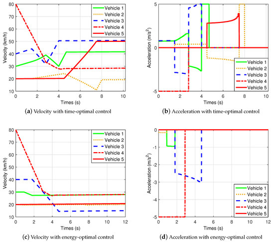 The velocity and acceleration profiles of the vehicles running with the two different performance criteria are shown in Figure 9. In the case of the time optimal control law, Vehicle 4 crosses the intersection first, followed by Vehicle 3, Vehicle 1 and Vehicle 5, while Vehicle 2 finally leaves the intersection at s. As shown in Figure 9a the velocities of each vehicles increase at some point and Vehicle 1 and Vehicle 3 uses the maximal possible acceleration for a short period of time, see Figure 9b. Note, that Vehicle 4 having a big initial velocity decelerates heavily before entering the intersection conflict zone, and as all other vehicles, keeps an even velocity after entering.