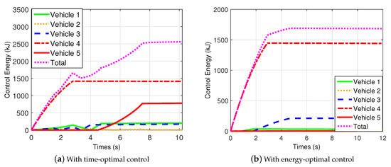 In Figure 10, the control energies (both driving and braking) of each vehicles are depicted along with the total control energy of all vehicles. It is well demonstrated, that the time-optimal solution shown in Figure 10a requires more than 2500 kJ of total control energy in contrast with the approximately 1700 kJ required by the energy-optimal centralized controller. Thus, for the given scenario, more than 800 kJ of total control energy can be saved in the intersection for the price of approximately 2 s in total traveling time.