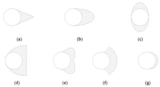 Schematic diagram of ice shapes: (a) trilateral shape, (b) crescent shape, (c) ellipse shape, (d) D shape, (e) D shape, (f) sector shape, (g) crescent shape.