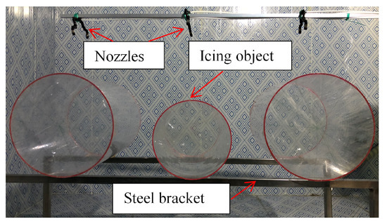 The laboratory had a work section with dimensions of 4.7 m (length), 3.7 m (width), and 2.6 m (height). The temperature T in the testing zone could be adjusted continuously between −20 and 20 °C with an accuracy of ±0.1 °C which was controlled and measured by a thermostat. Icing objects were supported on the steel brackets, as shown in Figure 2. Several air-atomizing nozzles were used to spray water to simulate the required rainfall intensity and environmental humidity. The vertical distances between atomizing nozzles and the top surface of icing objects were about 50 cm.