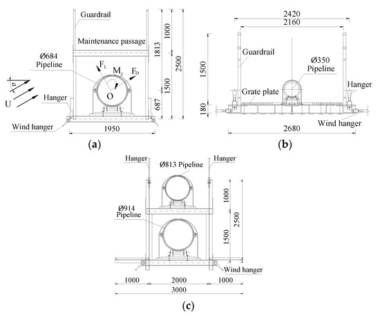 Pipeline bridges carry pipelines of natural gas, oil, or water across rivers, canyons, or other natural or man-made obstacles. Pipeline bridges are mainly designed as suspension bridges for cases with main span lengths over 200 m. Compared with highway suspension bridges, pipeline suspension bridges are much narrower, blunter, lighter, and more flexible, and thus, they are highly sensitive to wind action. As a result, wind loads should be carefully addressed to ensure the safety of a pipeline suspension bridge. If the pipeline is damaged by strong winds, the oil or gas will leak out, which can even result in catastrophic fire or explosion disasters. This would not only cause significant economic losses but also lead to heavy casualties and significant secondary environmental pollution. A natural gas pipeline exploded in the southeast of New Mexico in August 2000. Twelve people were killed, and two nearby pipelines bridges were severely damaged in the accident [1]. In November 2013, an oil pipeline exploded in Qingdao, China, and the blast killed 62 people [2].