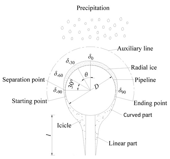 The ice shapes on pipeline suspension girders may be very different from those in the abovementioned objects. In addition, some experimental results demonstrated that the ice shape is dependent on the cylinder diameter D. Jones [30] showed that the uniform radial ice thickness of the circular cylinder is related to its diameter based on a precipitation model, and ice shape depends on the diameter of the wire. Koss et al. [14] experimentally investigated the ice accretion on circular cylinders (D = 38.1 and 89 mm) and showed that the thermodynamic solidification processes and ice surface characteristics are related to the diameter. Otherwise, Langmuir et al. [31] and Finstad et al. [32] showed that the droplet collision efficiency significantly decreases with increasing D in in-cloud icing. The pipeline diameters (300–1000 mm) of suspension bridges are generally much larger than those examined in the abovementioned studies (D ≤ 160 mm). Hence, those ice accretion shapes may be inappropriate for the pipeline. For this reason, it is necessary to further investigate the ice accretion shapes on pipelines over a wider range of diameters.
