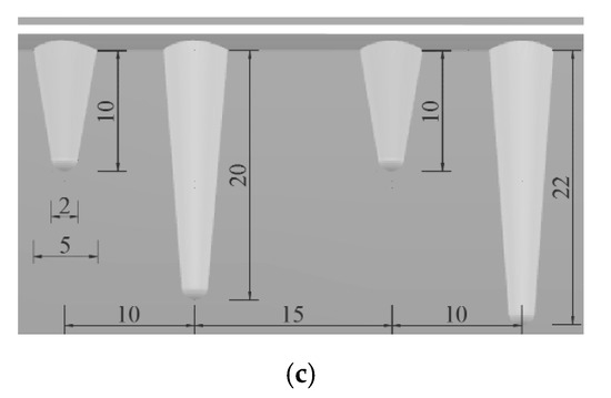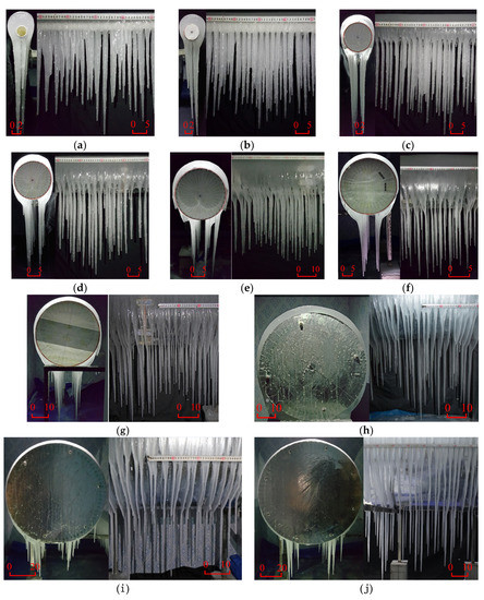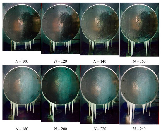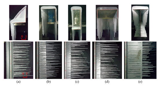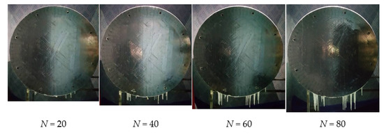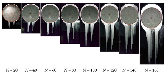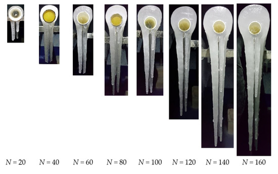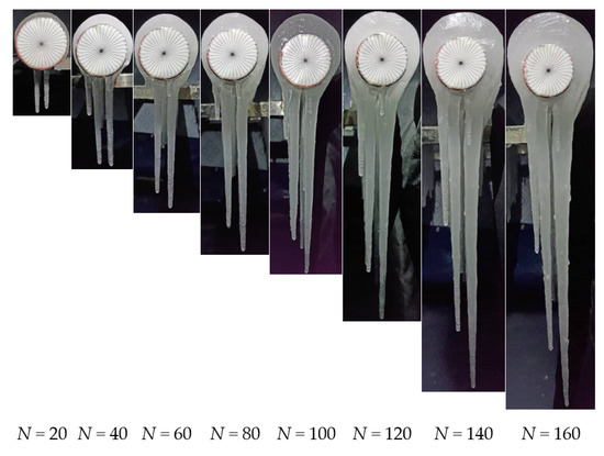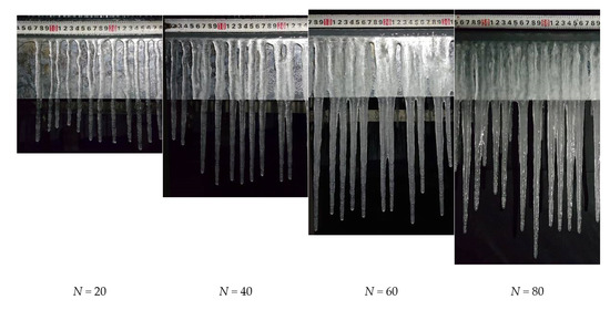 - As shown in Figure 18 and Figure 19, the icicles on all components could be simplified as circular truncated cones with s = 2–52 mm. The db of the icicle was about 5 mm, while dt increased with increasing N, and the adjacent icicles would connect after dt > s, therefore the individual icicles begin to merge into an icicle curtain. At the early stage, ice on the lateral wall was in the form of flat icicles, and only some local areas accreted ice. The whole range was almost uniformly covered by ice when N was large enough.