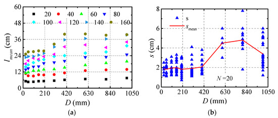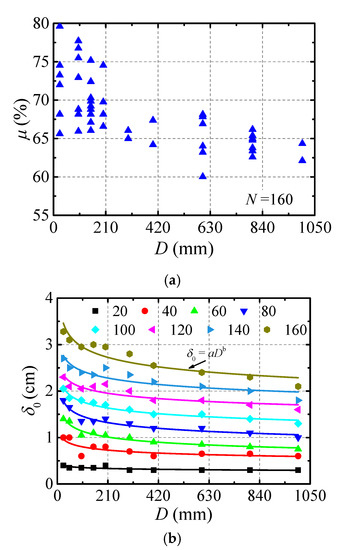 μ and l at different N: (a) D = 150 mm, and (b) D = 1000 mm.