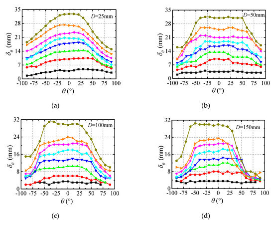 The radial ice sizes for pipelines with various diameters are shown in Figure 6. Figure 6a shows that the icing range of radial ice μ was non-uniform and decreased with increasing D. The radial ice thickness δ0 (Figure 6b) decreased with increasing D. δ0 and D approximately followed an exponential relationship: δ0 = a × Db. The values of δ0 were almost the same for the pipelines with various diameters in the early stage (e.g., N < 40 in the experiment), while δ0 increased in a similar manner with increasing N after the pipelines accreted a thin layer of ice. This suggested that the ice thickness differences mainly developed in the later stage (e.g., N ≥ 40 in the experiment). This can be explained as follows: (1) in the early stage, the area receiving droplets was proportional to the diameter, that is, to the amount of water contained along horizontal projected area of the cylinder, and consequently, the ice thicknesses for different D values developed at a similar speed; (2) at the later stage, the surfaces were covered by a thin layer of ice accretion, and the size effect of the ice accretion likely occurred because the Nusselt number depends on the Reynolds number, resulting that the heat transfer relates to D; (3) the collision efficiency of the droplets was smaller for large obstacles than for small ones. In summary, the ice sizes were closely related to the cylinder diameter, and the smaller diameter cylinder was more easily covered by ice.