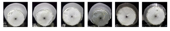 Generally, the range of the mean volume diameter (MVD) in freezing rain is from 500 μm to 3–4 mm [33]. The diameters of the sprinkler heads were 2.0 mm. Huffman et al. [34] showed that freezing rain is generally produced at temperatures ranging from 0 °C to −10 °C. The laboratory air temperature was set to −7 °C to accelerate the icing progress. The average humidity was set to around 80% at the position of icing objects based on the results of Jiang and Yi [35]. Freezing rain was reproduced in the tests, the precipitation rate in freezing rain is usually 1–2 mm/h, and in extreme cases 10 mm/h [30]. Unfortunately, the precipitation rate was set 45 mm/h in the experiment which was much higher than typical values encountered during freezing rain to hasten the icing process by referring to the recommend values 60 ± 20 mm/h in Farzaneh et al. [19]. It was impossible to produce more typical freezing rainfall rates of 1 mm/h without compromising the uniformity of the water supply along the cylinder [16]. Water was chilled to 0–2 °C before being transferred into the nozzles. The precipitation intensity was controlled by the water pressure, air pressure, nozzle size, and water flow rate supplied to the nozzles, which was measured near the center line of the icing objects with a pluviometer. Precipitation occurred in the top-down direction under calm condition. The temperature of the injected water droplets was higher than the surface temperature of the icing object, and the latent heat of the impinging supercooled water droplets was released during freezing. Therefore, the accreted ice would partly melt and the nozzles were easy to freeze if the water were continuously sprinkled if the water were continuously sprinkled. Hence, the water was not sprinkled continuously, but instead, cycles of a 2-min sprinkle and 5-min pause were repeated. Based on the test results as shown in the follow, the radial ice shapes in the experiment were similar with previous studies [14,26], which indicated that the pulsed spraying method did not affect the radial ice shape. After each spraying, the nozzles would be put into another holding room where temperature was about 1 °C to prevent the nozzles from freezing.