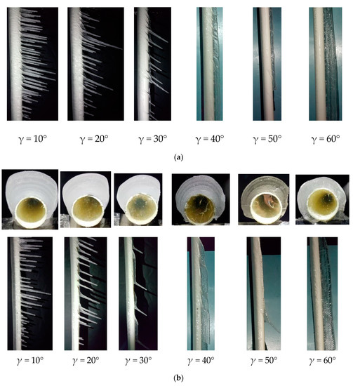 Kollár and Farzaneh [13] concluded that the ice mass accreted on a cylinder (D = 38 mm) decreased with increasing γ (γ = 61°–90°). The cylinders with D = 25–150 mm were taken as examples to investigate the influence of γ (γ = 0°–60°) on the ice shape and size on wind hangers. Figure 16 presents a series of photographs on the profiles and side views of ice deposits for D = 25 mm and 50 mm. The ice sizes are shown in Figure 17. In the lateral view, the separation point of the flow is well recognizable. The runback water flows mainly along the lower side of the wind hangers, giving rise to the formation of icicles or iced rivulets. Icicles are formed from the freezing of the water dripping or falling from wind hangers when γ = 0°–30°, while iced rivulets are produced due to the freezing of water flowing down along the wind hangers when γ > 30°. Iced rivulets were located around the flow separation line. The roughness of the radial ice increased with increasing γ. The thickness of the radial ice gradually decreased from the top to the bottom along the wind hangers, since the droplets were continuously captured and condensed into ice on the wind hangers when they flowed downward, and some of them could not flow to the bottom. The maximum δ0 decreased with increasing γ, which agrees well with the results of Kollár and Farzaneh [13]. That is ascribed to the fact that the amount of the downflow water along the wind hanger increases with increasing γ. And l also decreased with increasing γ. Because more droplets flowed down the wind hanger with increasing γ, and the less droplets can be captured by the icicles.