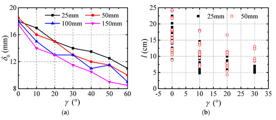Ice sizes of wind hangers versus γ (N = 100): (a) maximum δ0, and (b) l.