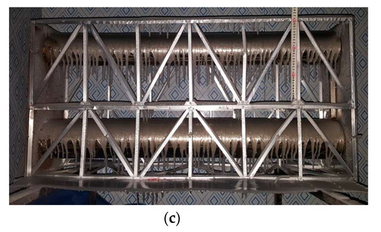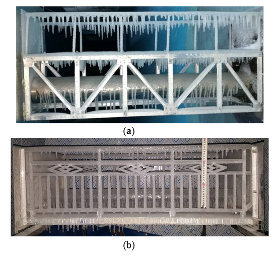 - The ice thicknesses and ice shapes on the pipelines of the section models were roughly the same as those on the circular cylinders described in Section 3.1. Only one row of icicles was formed under each guardrail of girders A and B due to its small diameter (D = 10 mm), which agreed with the results for ice accretion on transmission lines [37].