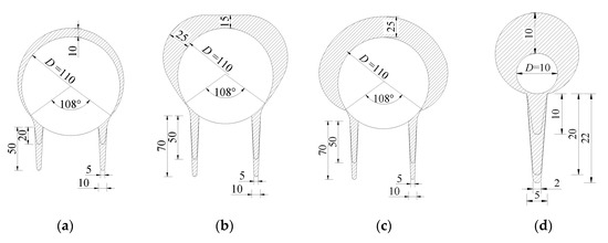 Schematic diagram of iced pipeline and guardrail (mm): (a) pipeline with crescent-shaped ice, (b) pipeline with D-shaped ice, (c) pipeline with sector-shaped ice, and (d) guardrail with crescent-shaped ice.