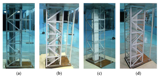 As shown in Figure 24, the model was fixed to a six-direction-component high-frequency balance (under the steel plate in Figure 24) by four screws, and the point O in Figure 3a was located at the center of the screws. The measurement ranges of the three forces were 0–300, 0–300, and 0–600 N, respectively, and the ranges of the bending and torsional moments were 0–57 N·m, with a relative precision of 0.06% of the full-scale. A thin steel plate with 1.2 m width and 1.2 m length was placed on the top end of the model to ensure nominally two-dimensional flow. The acquisition time was 30 s, and the data-sampling frequency was 100 Hz. α varied in the range of −12° to 12° with an increment of 1°.