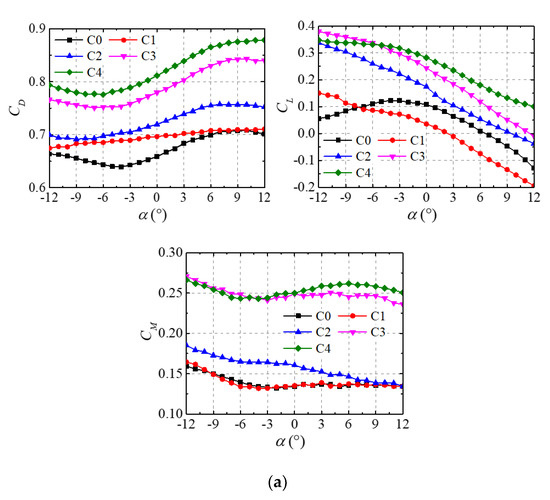 Aerodynamic force coefficients of section with various ice classes are shown in Figure 25. Because of the asymmetry of the section, the aerodynamics force coefficients were not symmetric between α = −12° to 12°. Aerodynamic force coefficients were significantly affected by ice class. CD increased with increasing ice class, especially for the C3 ice class, which can be ascribed to the increase in the windward area after icing. Aerodynamic force coefficients increased after the pipeline with icicles. CL and CM increased after the guardrail with ice, especially the CM. CL and CM were slightly affected by the ice on guardrail and grate plate. The influence of α on CD for C1 ice class was smaller than that for C2–C4 ice class. CL decreased, and then increased with increasing α for ice-free section, while CL decreased with increasing α for ice-accreted section. For C0 and C1 ice class, CM decreased with increasing α in the range of α = −12° to −3°, and then was almost invariant in the range of α = −4° to 12°. CM decreased with increasing α for C2 ice class. Meanwhile, CM decreased, then increased, and finally decreased with increasing α for C3 and C4 ice class.