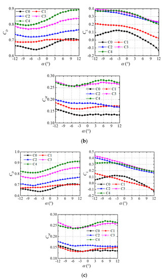 Aerodynamic force coefficients of section with various ice classes (U = 15.5 m/s): (a) pipeline with crescent-shaped ice, (b) pipeline with D-shaped ice, (c) pipeline with sector-shaped ice.