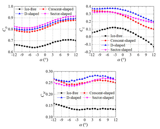 Aerodynamic force coefficients of section with various ice types for C4 ice class were shown in Figure 26. Ice accretion had a negligible effect on the variation of the aerodynamic force coefficients with α. CL of the ice-free model gradually increased with increasing α in the range of α = −12° to −2° and then gradually decreased with increasing α in the range of α = −2° to 12°. CL for the pipeline with D-shaped ice was almost invariant in the range of α = −12° to −3° and then gradually decreased with increasing α. The CL values for pipelines with crescent- and sector-shaped ice gradually decreased with increasing α. The CL and CM values for the pipeline with D-shaped ice were larger than those with crescent- and sector-shaped ice. In conclusion, the aerodynamic force coefficients of the iced sections were much higher than those of the ice-free one, which may be ascribed to the large windward area and the asymmetry of the ice-accreted section.