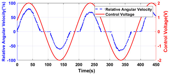 To reproduce the vibration phenomenon in the SISP with a light base support, an Euler method numerical analysis was performed in MATLAB. The relative angular velocity was obtained via the angle measured by the encoder and the differentiator. The base angular velocity is a sine signal (1 Hz, 10/s). The gains of the PI feedback controller are tuned as and . The total disturbance torque employed the Stribeck friction model, including Coulomb friction, viscous friction, and Stribeck phenomenon, which is a nonlinear low-velocity friction effect [38]. The numerical analysis parameters and results are presented in Table 1 and Figure 3, respectively.