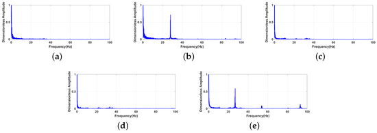Single-sided dimensionless amplitude spectrum of the relative angular velocity. (a) Group A; (b) Group B; (c) Group C; (d) Group D; (e) Group E.