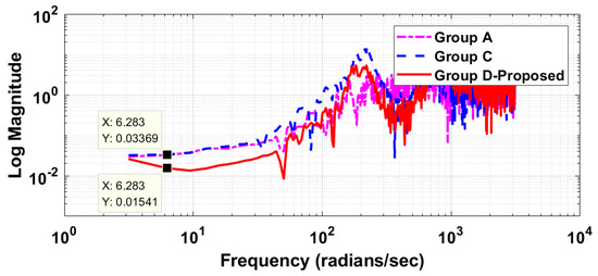 From Figure 15, there is a peak of 26 Hz in Groups B and D, which has a negative effect on this system. If the modified controller (28) is used, the signal is redesigned. The vibration frequency is suppressed successfully similar to that in Groups A, C, and D.