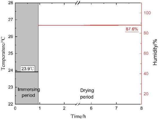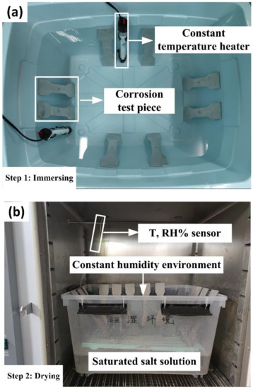 Since there is no corrosion test box for controlling humidity by saturated salt solution, this test was conducted by manual method. First, we placed the test piece in the liquid tank for immersion by artificial immersion. After reaching the specified immersion time, we removed the sample and placed it in the electric constant temperature drying box. The bottom of the closed container in the drying box contained about one-third of the total volume of saturated KCl salt solution. The upper space of the salt solution was an environment with constant relative humidity, and the temperature was set to 23.9 °C. At this temperature, in the literature [26,27], the saturated KCl salt solution produces a constant humidity environment with relative humidity (RH%) between 84–85%, while the measured relative humidity of the humidity environment on the upper side of the closed container was 88%, which is very close to the average humidity of 87.6% in Wanning, Hainan. The error did not exceed 0.5% and it had good simulation. We carried out the cycle in turn. The process is shown in Figure 2. According to the alternate immersion test standard for metals and alloys (GB/T 19746-2018), the surface area ratio of the test piece in the corrosion tank and the accelerated corrosion solution was 30 mL/cm2. The pH value of the corrosion solution was measured every other day. When the pH changed more than 0.2, we increased the acid solution, according to the ratio of H2SO4 and HNO3 in Table 3, to restore and adjust the pH value to ensure that the corrosion environment in the entire process of the accelerated corrosion test in the laboratory remained consistent.